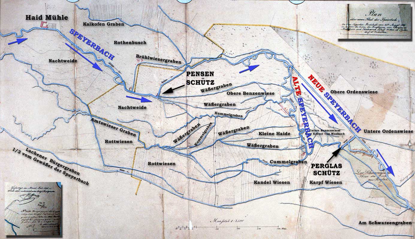 Aktuelle Situation von 1836, man beachte die Darstellung des begradigten Speyerbaches ("Alte Speyerbach, Neue Speyerbach"), der eingetragene
