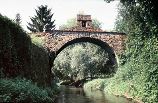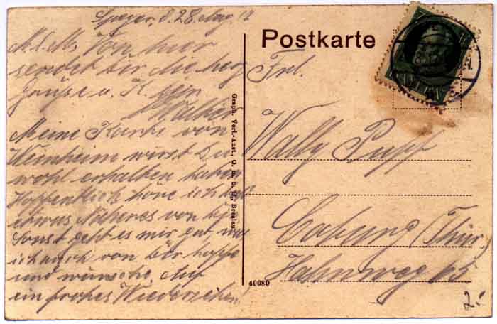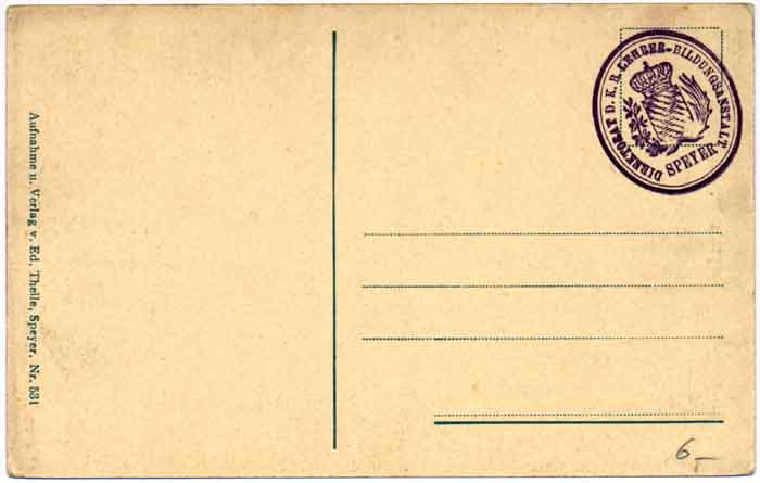 Speyer, "Am Riegel", hier durchbricht der Speyerbach (Woogbach) die Stadtmauer, Aufnahme um 1917, deutliche Veränderung innerhalb von 12 Jahren, gleiche Blickrichtung, der Bach ist anscheinend kanalisiert worden, Bäume sind verschwunden, alles erscheint strukturärmer! Und so sieht das ganze heute aus!