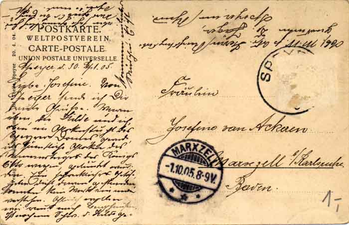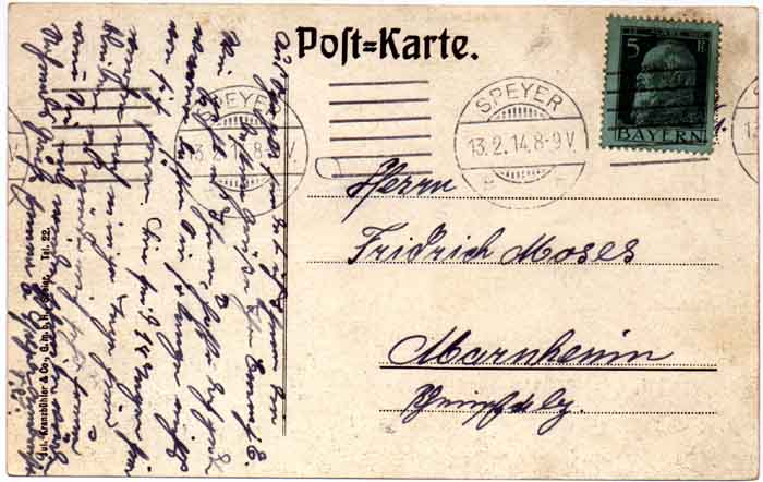 Speyerbach im Bereich der Sonnenbrücke, Aufnahme ca. 1915, im Hintergrund der Dom
