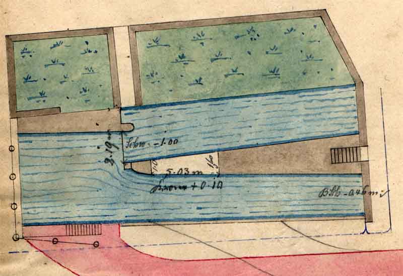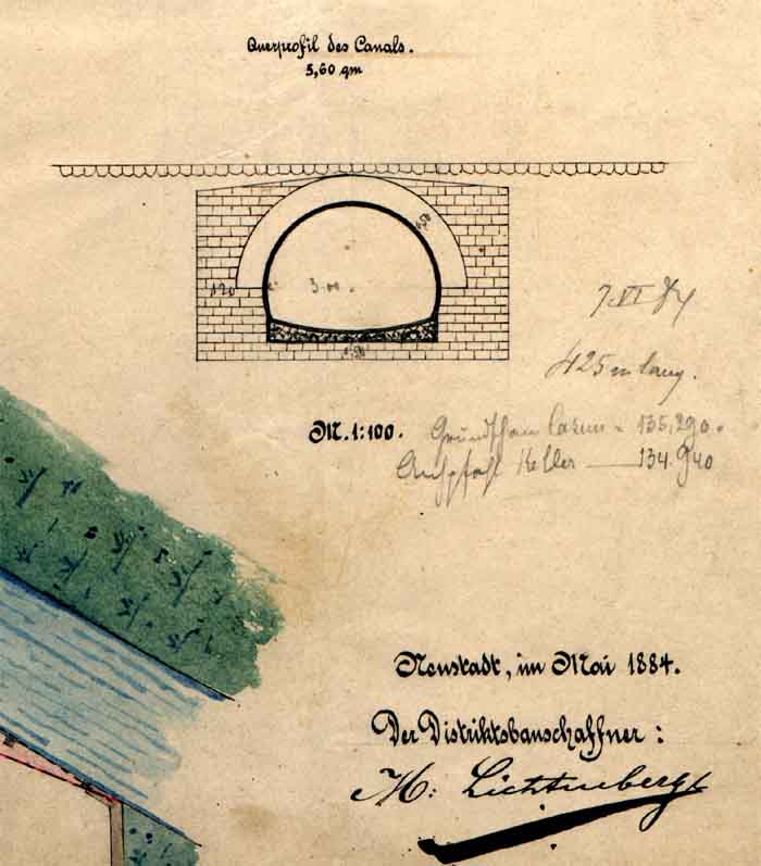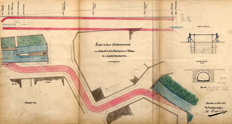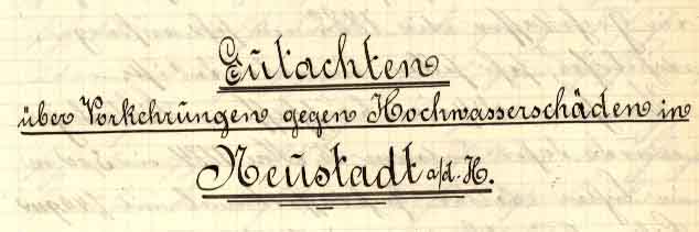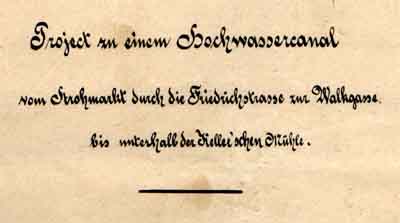| Gutachten von 1884 zu einem geplanten Hochwasserschutzkanal nach dem verheerenden Überschwemmungen des Jahres 1882 in der Neustadter Innenstadtsiehe auch Ansicht des Neptunplatzes (Bild 1 - 1905, Bild 2 - 1925) auf hist. Foto, Triebwerkskanal heute (Bild 1, Bild 2, Bild 3) Textauszüge...